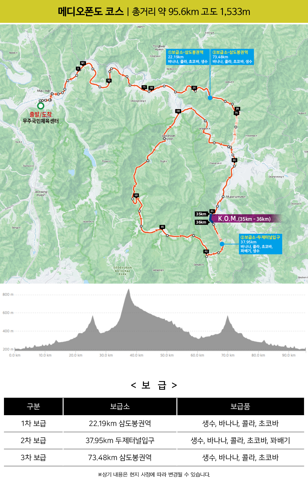 - 선수는 자전거에 칩을 장착하고 지정된 코스를 주행하여 정해진 계측장치를 반드시 통과해야 한다. (출발지점→중간계측지점→도착지점)