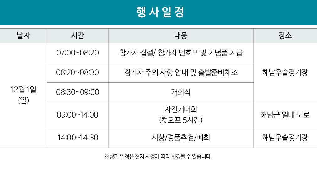 (날씨등으로 인해 충분히 몸을 풀고 참여해 주시길 당부 드리며, 행사 당일 건강 이상 시(감기,고열,고혈압,저혈압 등) 참여를 고려해 주시길 바랍니다.)