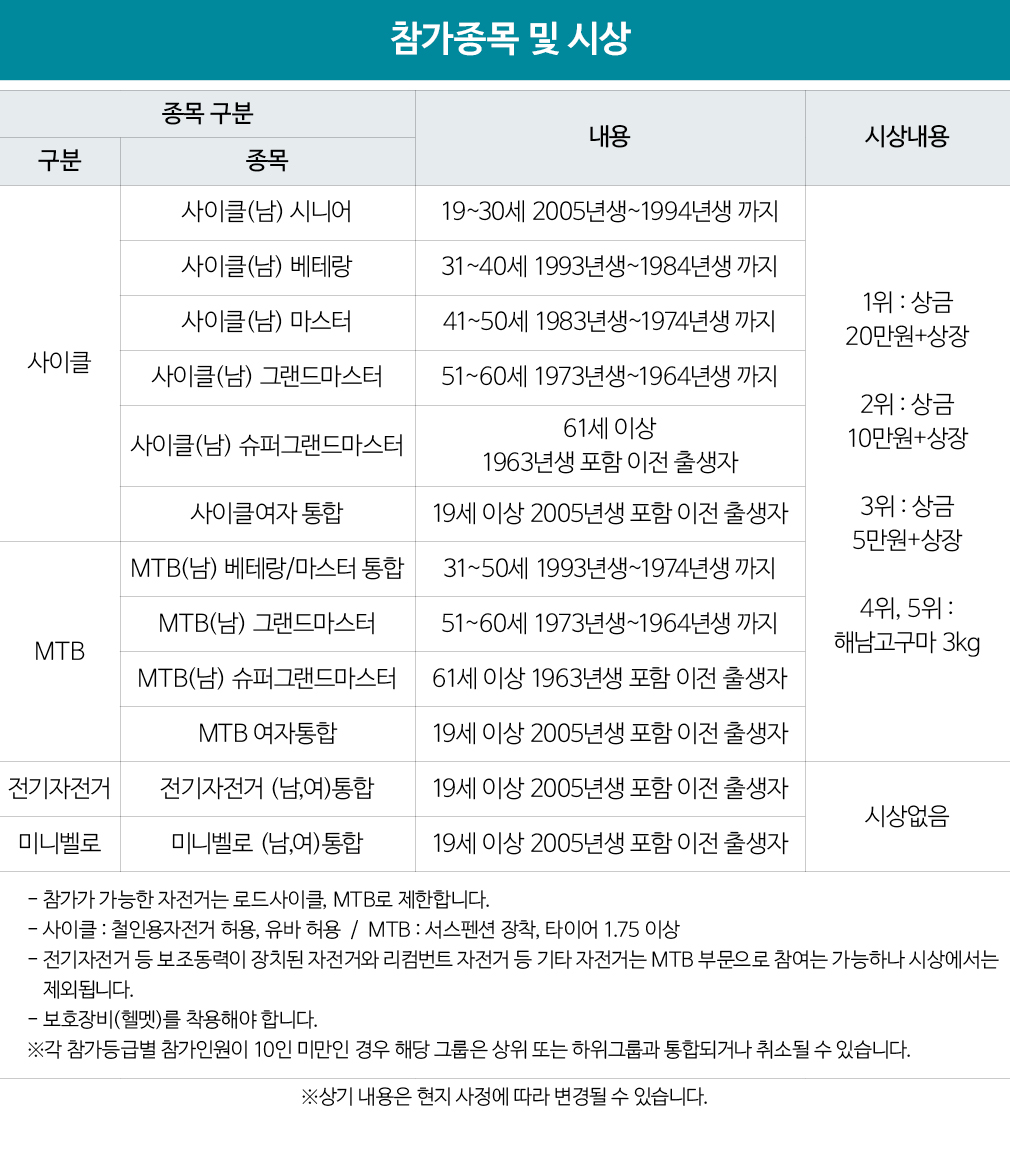 ※단, 대한사이클연맹, 철인연맹, 경륜선수로 등록된 엘리트 선수 및 등록 종료 후 3년 이내인 선수는 번외로만 참여가능 시상제외)