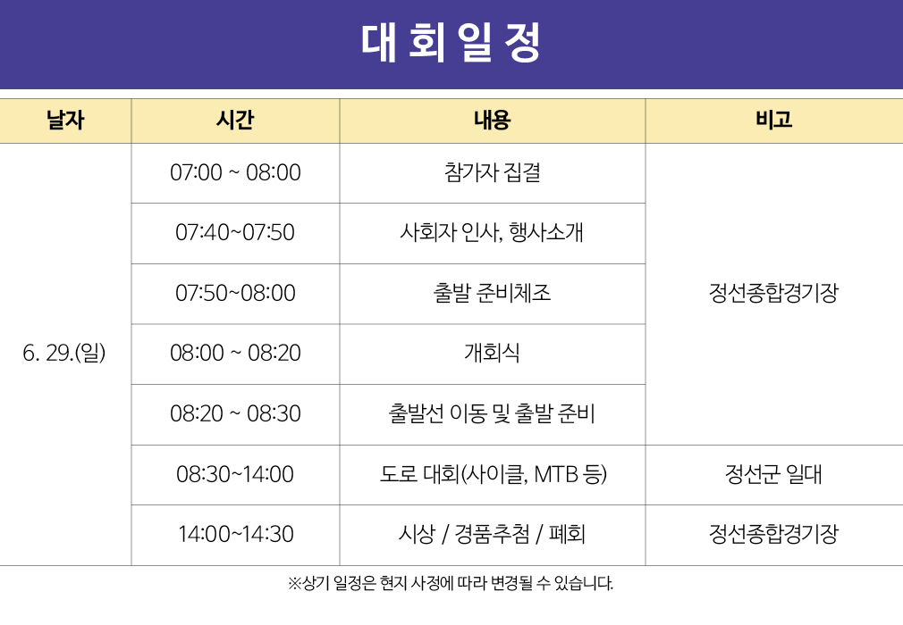 *날씨등으로 인해 충분히 몸을 풀고 참여해 주시길 당부 드리며, 행사 당일 건강 이상 시(감기,고열,고혈압,저혈압 등) 참여를 고려해 주시길 바랍니다.