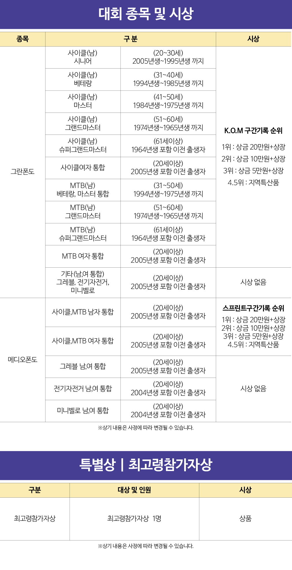 계측 및 순위결정 : 전체구간 계측은 넷타임으로 계측하며,순위 결정은 K.O.M구간 계측 순위로 시상 한다.