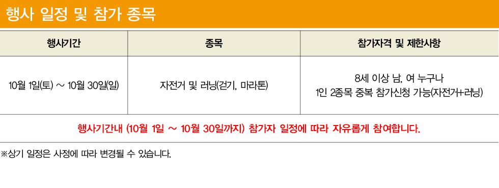 - 본 행사는 10월 01일~10월 31일까지 개인 일정에 따라 자유롭게 참여하는 행사로, 주최측에서 도로통제 및 안전사항 지원이 불가합니다.