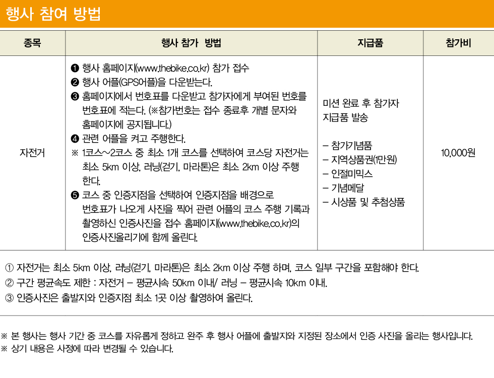 관련 어플을 이용하여 참가자 개인이 정한 코스를 자전거 최소 5km,러닝 최소2km이상 주행하고 인증사진을 업로드하여 미션을 수행하는 행사입니다.