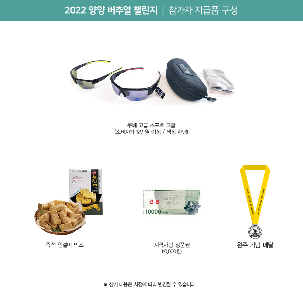 ▶ 미션 수행후(제시한 코스 중 2~5km이상 주행(자전거)후 출발지 인증사진, 인증지점 촬영사진, 관련어플 코스주행 캡쳐 업로드 하시면 기념품(12만원이상 쿠베 스포츠고글) + 지역상품권(1만원권) + 즉석 인절미 믹스 + 기념메달 + 시상 및 경품 추첨 상품 발송