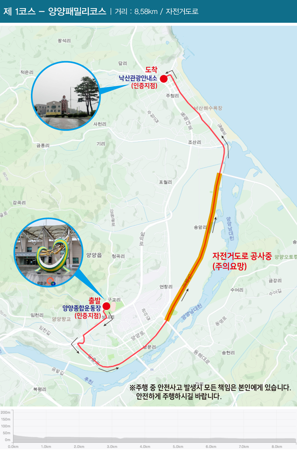 강원도 양양군 내, 주어진 코스를 완주하거나, 주어진 코스중 자전거는 최소거리 5km 이상,러닝은 최소 2km이상을 주행하여야 합니다.