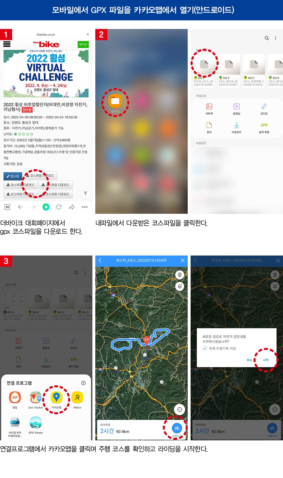 ③어플 주행기록 캡처, 출발지점 사진, 인증지점 사진을 접수홈페이지(www.thebike.co.kr) 인증사진 올리기 제목에 함께 촬영한 참가자 번호를 모두 적어 올린다.