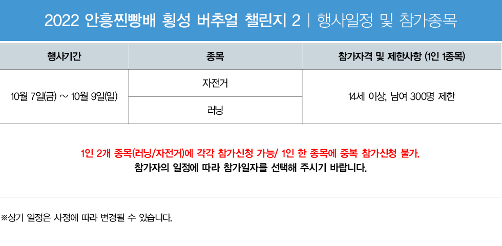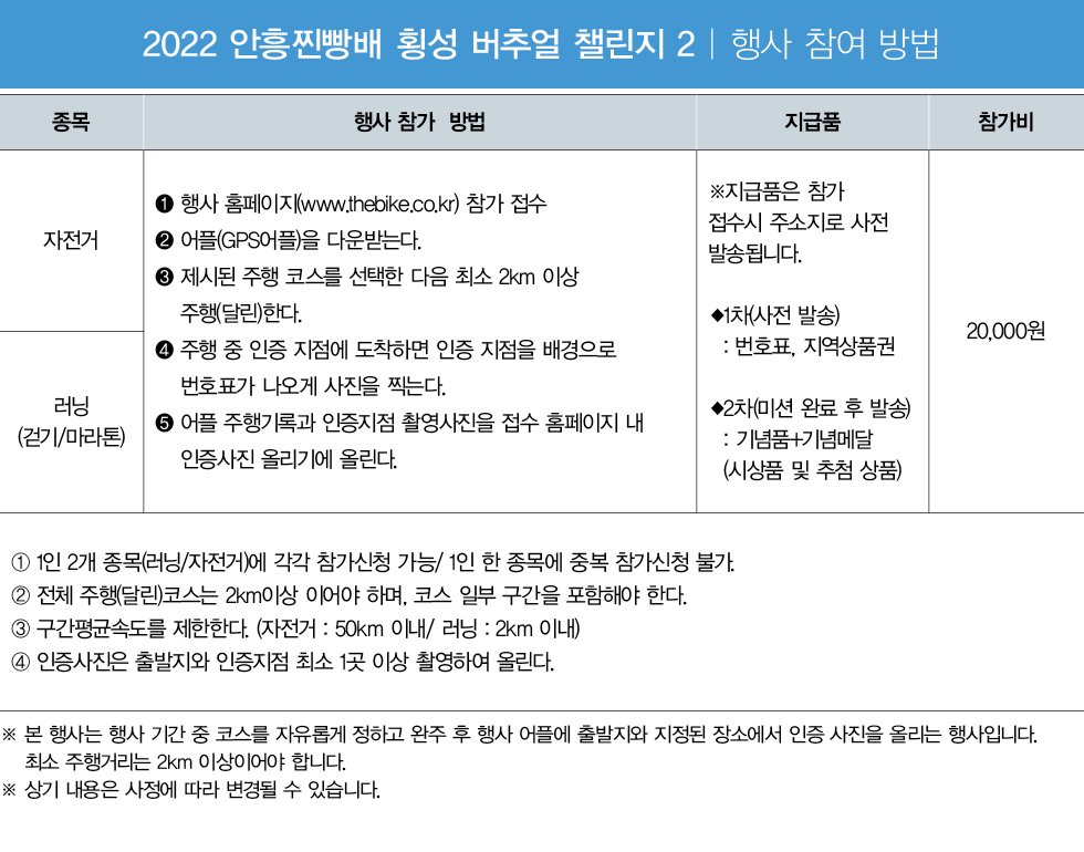 2022안흥찐빵배 횡성 버추얼 챌린지2는 라이딩 관련 어플을 이용하여, 안흥찐빵 축제 기간 내(2022. 10.07~10월09일)에 자전거와 러닝(걷기/마라톤)을 자유롭게 참여 하는 행사입니다.