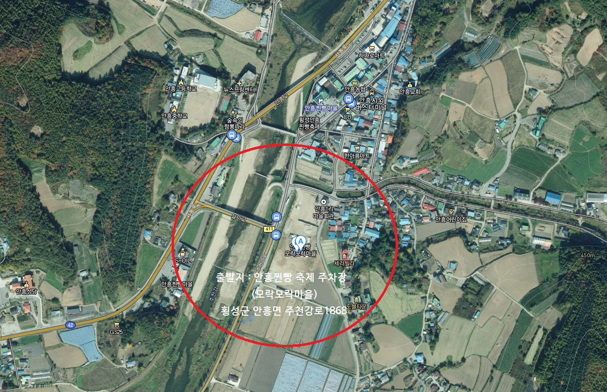 출발지:안흥찐빵 축제장(모락모락마을) 주차장 / 횡성군 안흥면 주천강로 1868