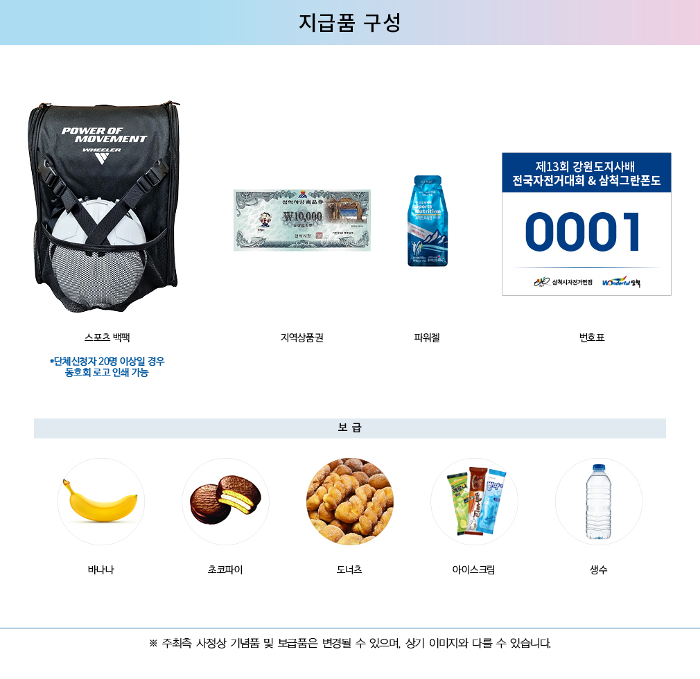 - 주최측은 주최자 배상책임공제에 가입되어 있으며, 주최자 배상책임공제는 주최측 및 주관사의 과실에 의한 손해를 담보하는 보험으로 대회 도중 일어나는 모든 사고(기술부족, 도로파손, 참가자간의 충돌, 도로의모든 이동 물체와의 사고)는 본인의 부주의 사고로 책임은 본인에게 있고 누구에게도 이의를 제기 할 수 없으며 역시 주최측 및 주관사에서 책임 지지 않습니다.