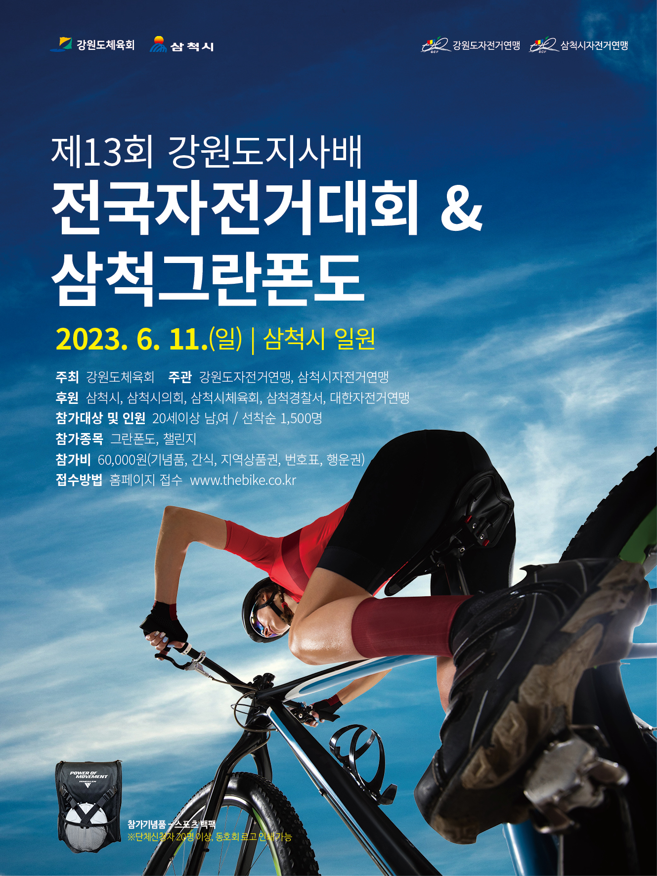 강원도지사배 전국자전거 대회 및 삼척그란폰도는 일반참가자 1,200명과 강원도자전거 연맹 소속 지역참가자 300명 구성으로 총1,500명을 선착순 모집하고 있습니다.