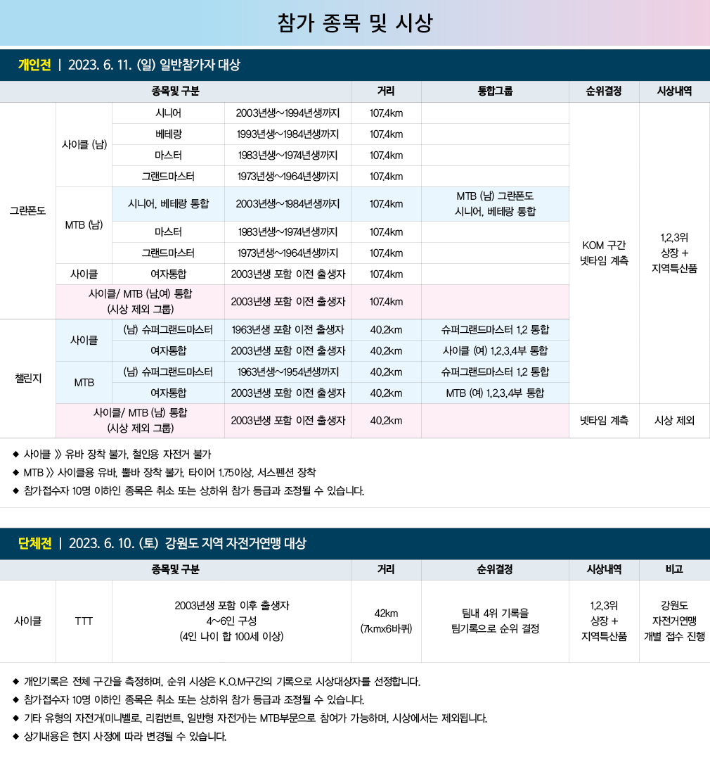 - 사이클, MTB, 하이브리드, 일반형 자전거 등 다양한 형태의 자전거가 참여할 수 있음 시상은 사이클/MTB 만 가능