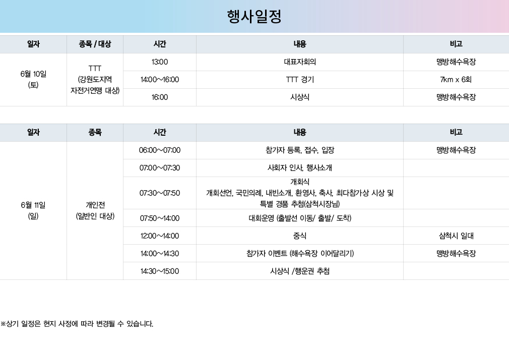 - 대회 시간 규정은 MTB.사이클: 6시간 이다.