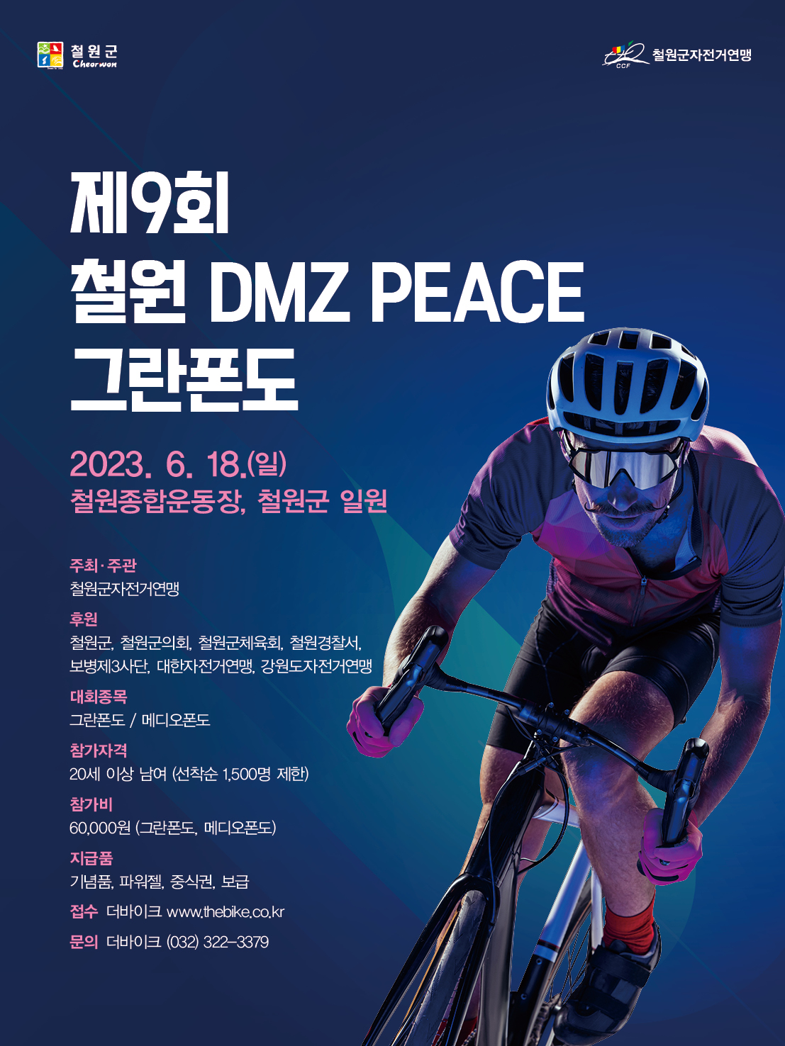 제8회 철원DMZ PEACE 그란폰도 및 메디오폰도는 2023년 6월 18일(일요일) 07:30에 출발하여,그란폰도144.42km(누적고도2,078m),메디오폰도102.75km(누적고도1,131m)로 진행됨.