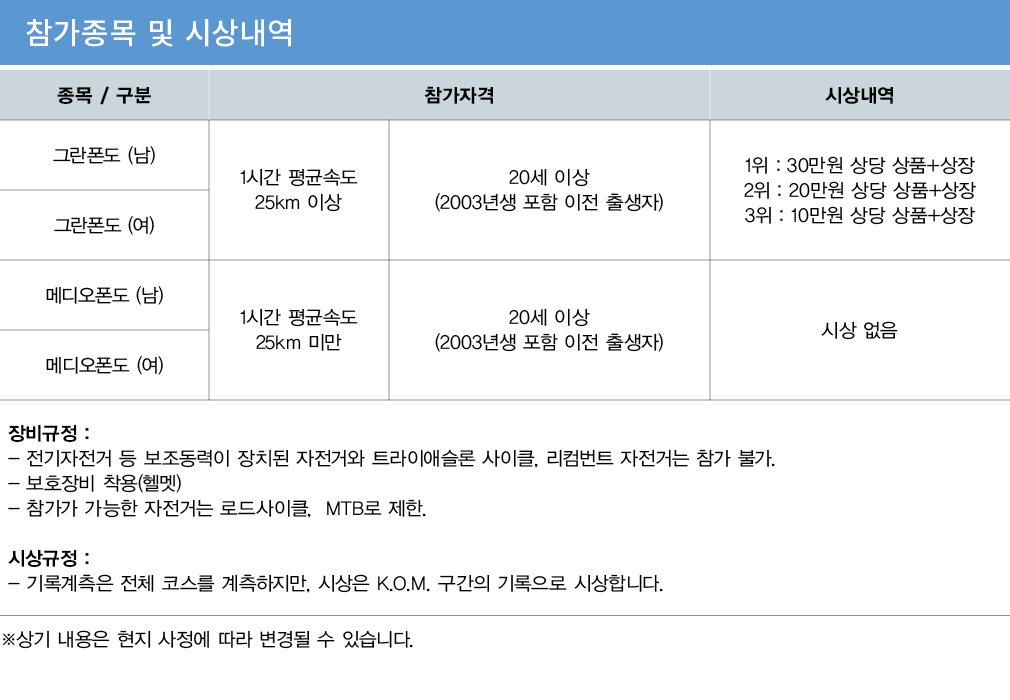 -참가선수는 대회 중 사고에 대비하여 적절한 보험가입을 권장합니다. 참고로, 자전거 보험은 메드인(Tel:02-733-9598,http://facebook.com/medincam-paign)에서 취급하고 있습니다.