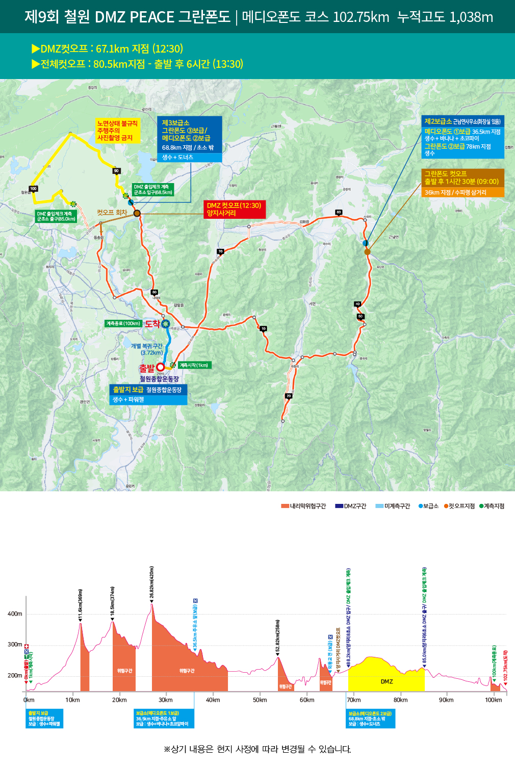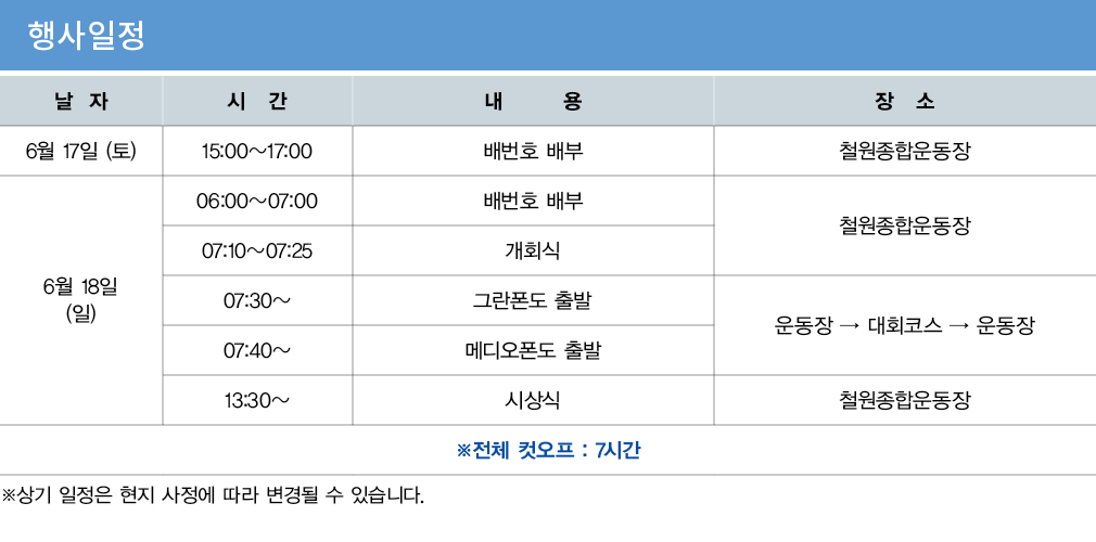 -주최측은 참가자의 안전에 필요하다고 판단 될 경우 참가자의 동의 없이도 코스의 길이 및 경로를 변경 할 수 있다.