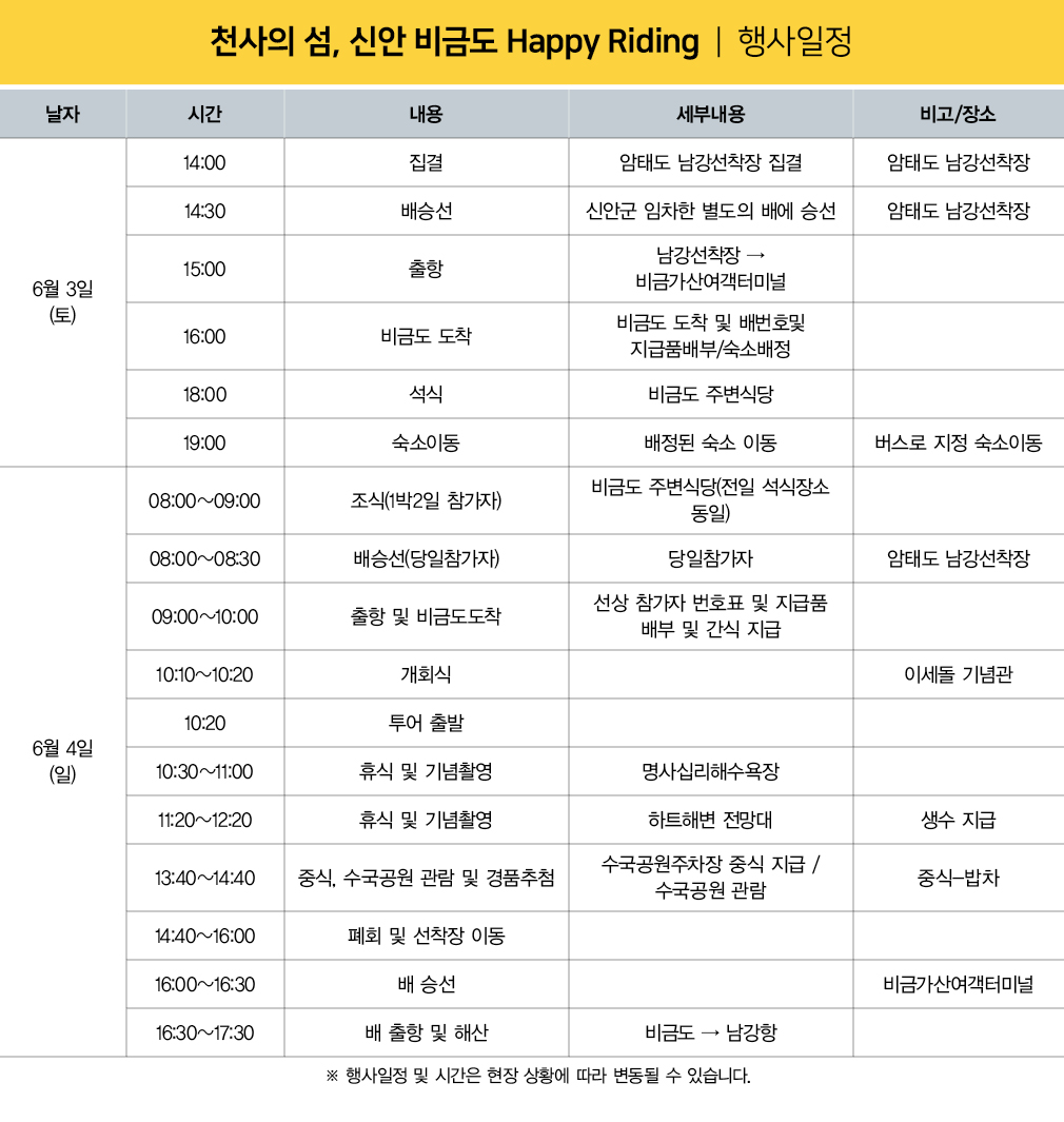 ▶1박2일 참가자 : 6월 3일(토) 오후 2시 암태도 남강선착장 집결 후 오후 3시 출항합니다.