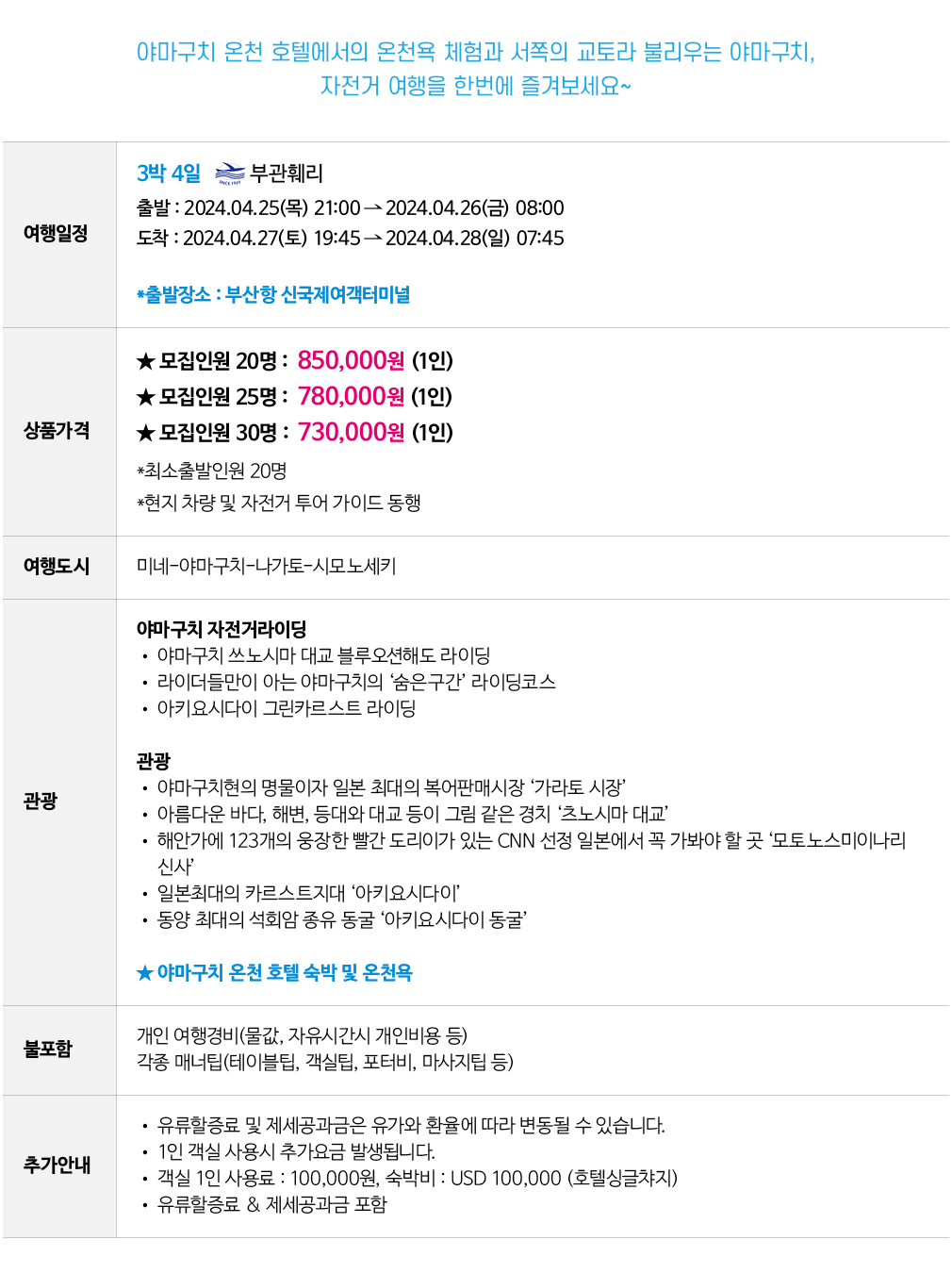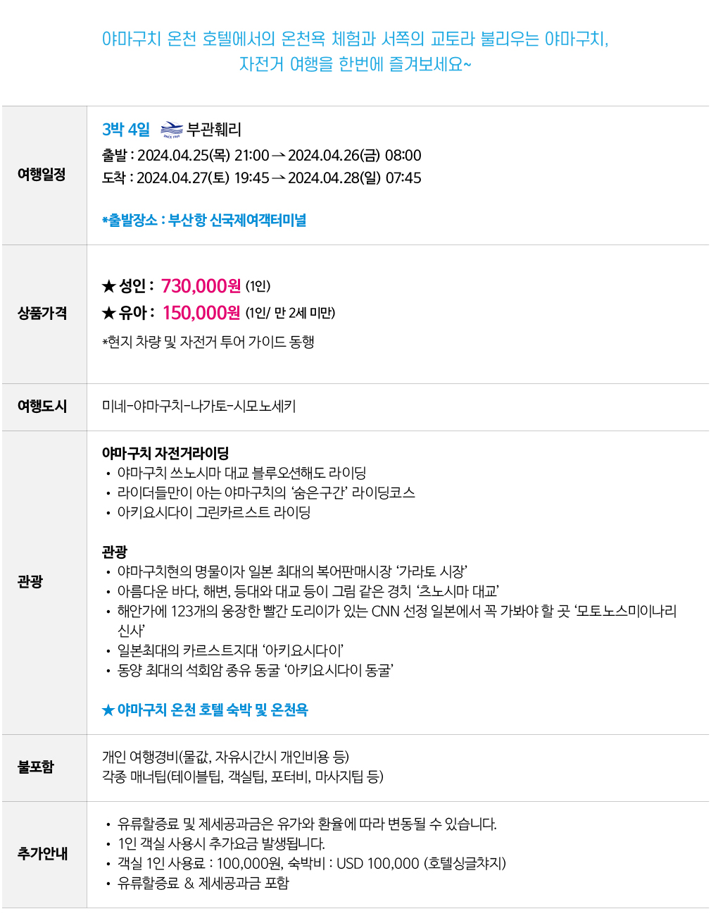 일본 야마구치현은 부산에서 직항로를 통해 바로 떠날 수 있는 해외 여행지로 현지에서는 사이클현으로 불릴 만큼 사이클 코스가 굉장히 잘 되어 있으며, 경치 또한 신비롭고 아름다운 곳이다. 이번 호는 내년 봄 시즌 투어 예정인 ‘일본 야마구치현 자전거 투어’ 답사를 위한 방문이었다.